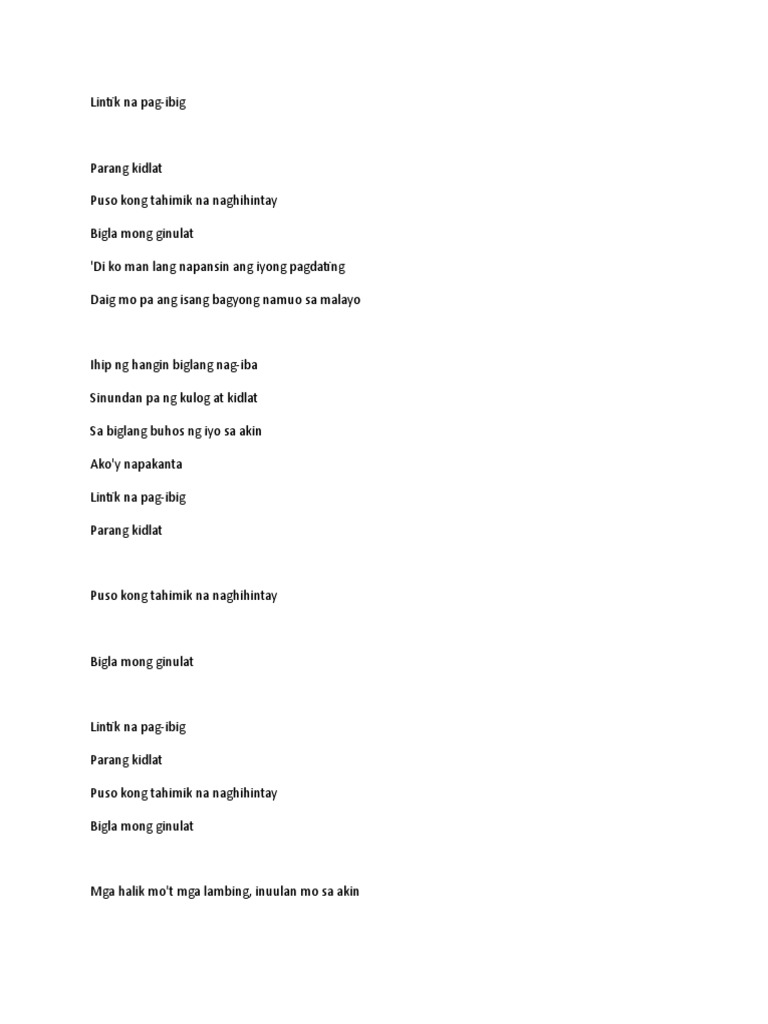 Lintek na pag-ibig parang kidlat. Lintik na pag-ibig Parang kidlat Puso kong tahimik na naghihintay Bigla mong ginulat Di ko man lang napansin ang iyong pagdating Daig mo pa ang isang bagyong namuo sa malayo Ihip ng hangin biglang nag-iba Sinundan pa ng kulog at kidlat Sa biglang buhos ng iyo sa akin Akoy napakanta Lintik na pag-ibig Parang kidlat Puso kong tahimik na naghihintay Bigla mong ginulat Lintik na pag-ibig Parang. G-C-G-C sabay ng percussion Dm-G-C Lintik na pag-ibig Parang kidlat Puso kong tahimik na naghihintay Bigla mong ginulat Dm-G-C di ko man lang napansin ang iyong pagdating Daig mo pa ang isang bagyong namuo sa malayo Ihip ng hangin biglang nag-iba Sinundan pa ng kulog at kidlat Sa biglang buhos ng iyo sa akin Akoy napakanta Dm-G-C Lintik na pag-ibig Parang kidlat. February 13 2020.